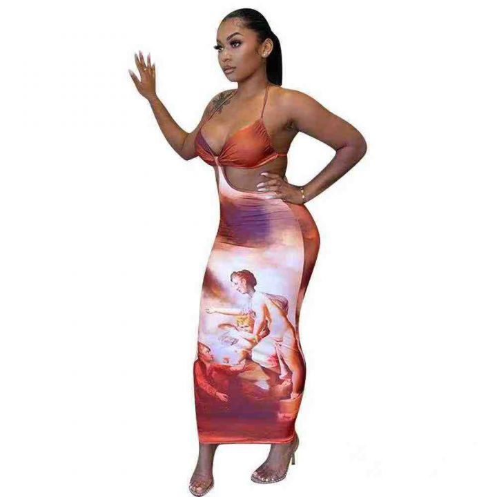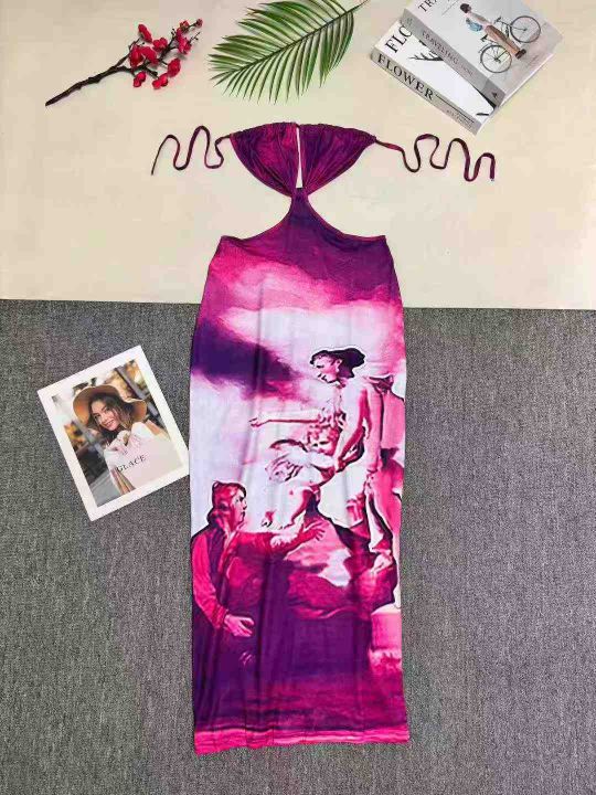 欧美时尚抹胸挂脖印花连衣裙 ,整款三色,数量:320条左右,码数S-2XL,品质好,拉链式独立包装。