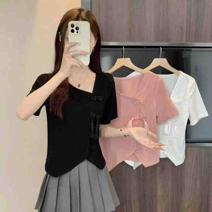 电商仓回收662件国风新中式精致盘扣不规则靓妹短袖T恤上衣,码数S-4XL。款式不错,面料柔软舒适有弹力,独立包装,分货➕0.5