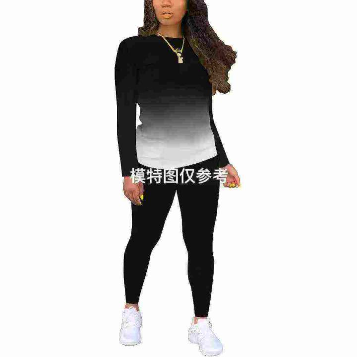 欧美女装爆款休闲渐变色两件套装 ,上衣两侧开衩设计,图片款,数量:800套左右,码数:S-2XL,品质好,拉链式独立包装。