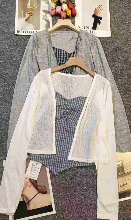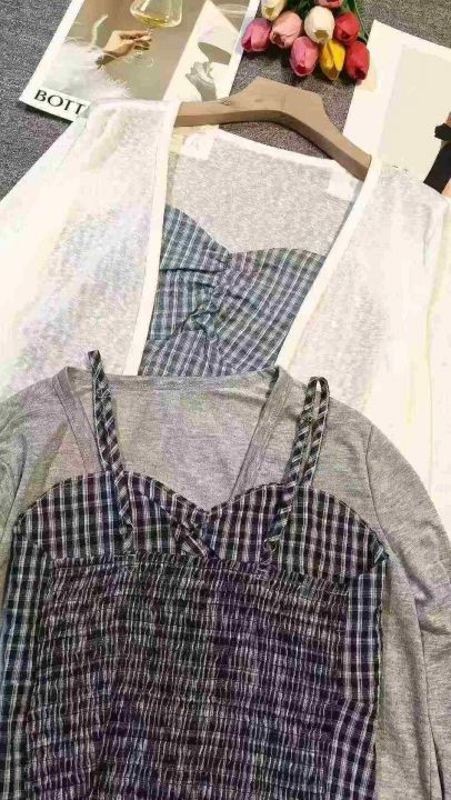 韩系不规则设计感格子吊带➕防晒开衫套装,[爱心]135套左右,灰色为主,码数S-L,穿80-130斤,万佳档口货,原包装️无瑕疵,[666]实体店品质,分货加一