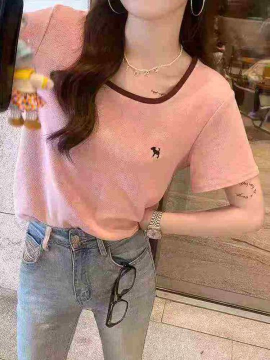 品牌纯棉撞色刺绣圆领修身显瘦短袖,[爱心]300件左右,粉色为主其它颜色几件,尺码S-XL,穿80-120斤,原包装瑕疵,分货加一