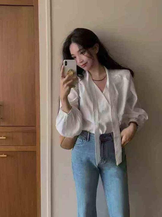 750件左右法式高级感洋气气质百搭长袖V领别致不规则绑带泡泡袖衬衫上衣,做...