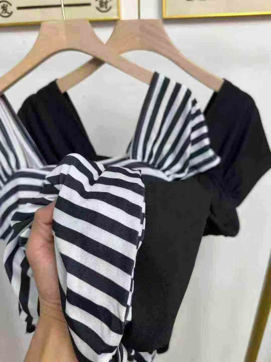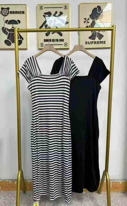 天猫在售款500件左右高品质夏季小个子撞色条纹方领短袖连衣裙,码数S-L,单款两色,高弹力,独立包装带吊牌