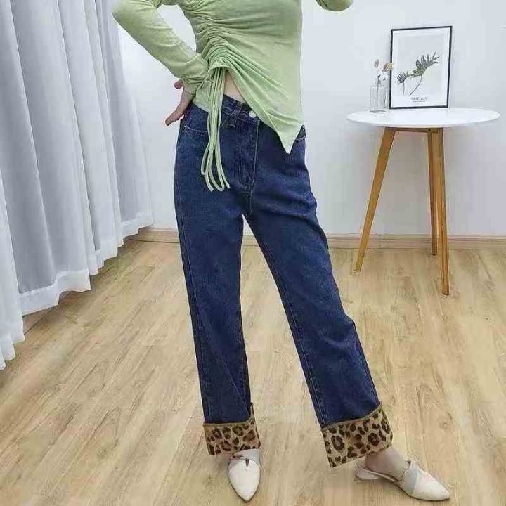 高腰牛仔直筒裤显瘦小个子加绒深蓝美式豹纹直筒烟管裤180件,独立包装带吊...