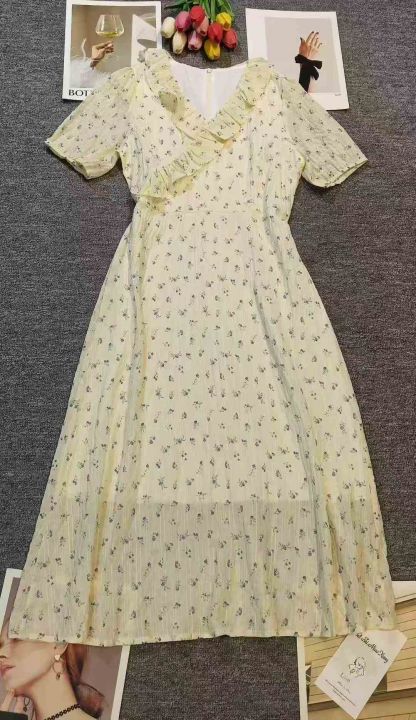 韩系温柔超仙黄色V领碎花连衣裙,[爱心]45件左右,款号#26185,码数S-XL,穿80-140斤,万佳档口货,原包装️无瑕疵,[666]实体店品质
