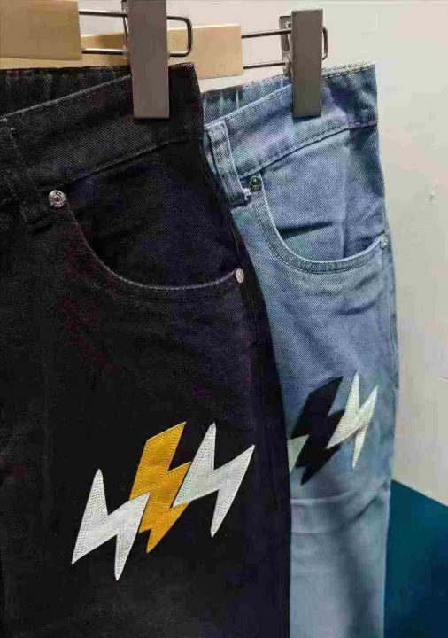 水洗棉直简微喇叭长裤松紧腰美式潮牌宽松闪电皮刺绣牛仔裤,488件,S-2XL,男女同款,独立包装,全清13.8元,分货+0.5