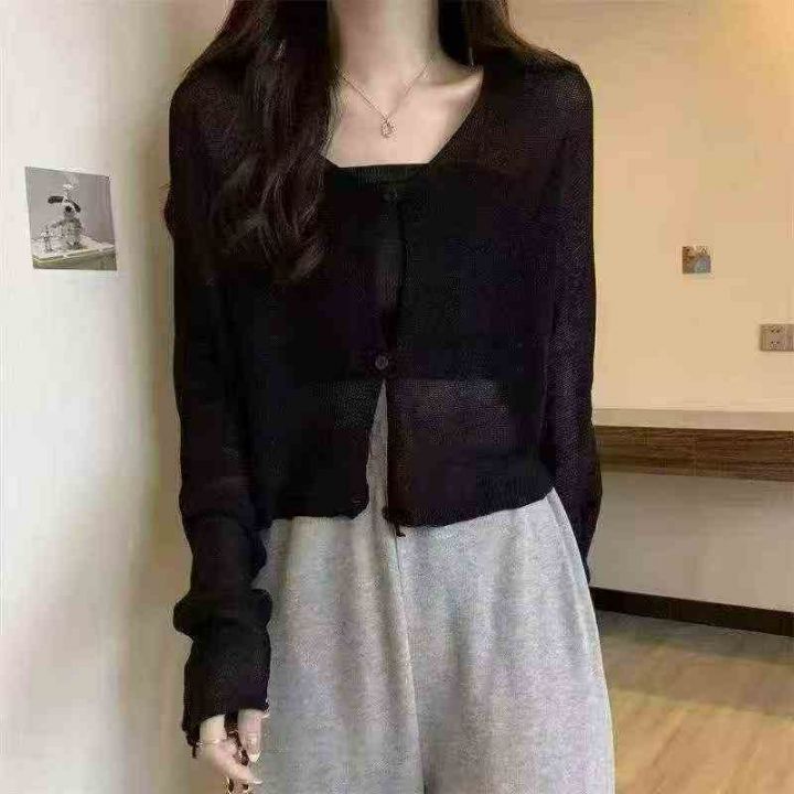 春夏新款冰丝韩系穿搭净版简约宽松薄款纯色针织长袖开...
