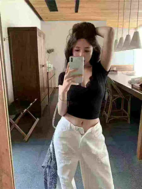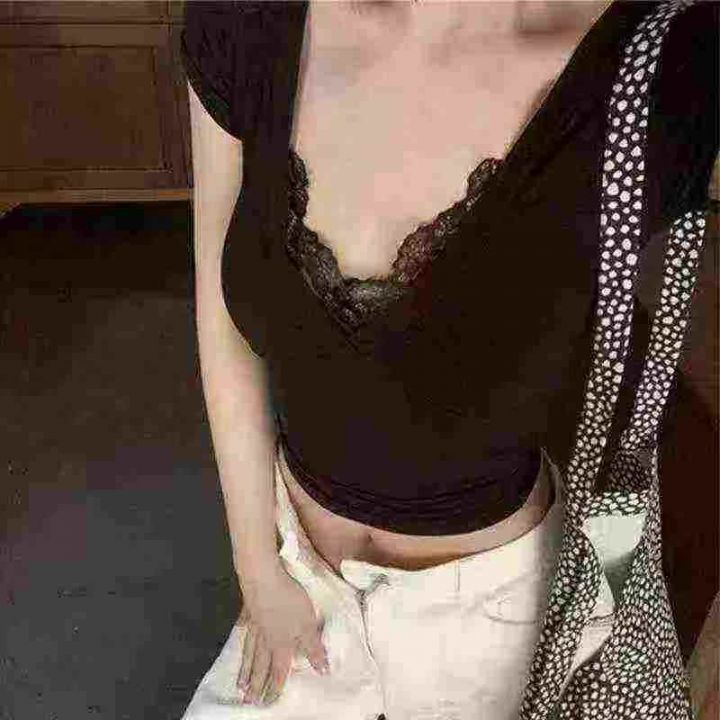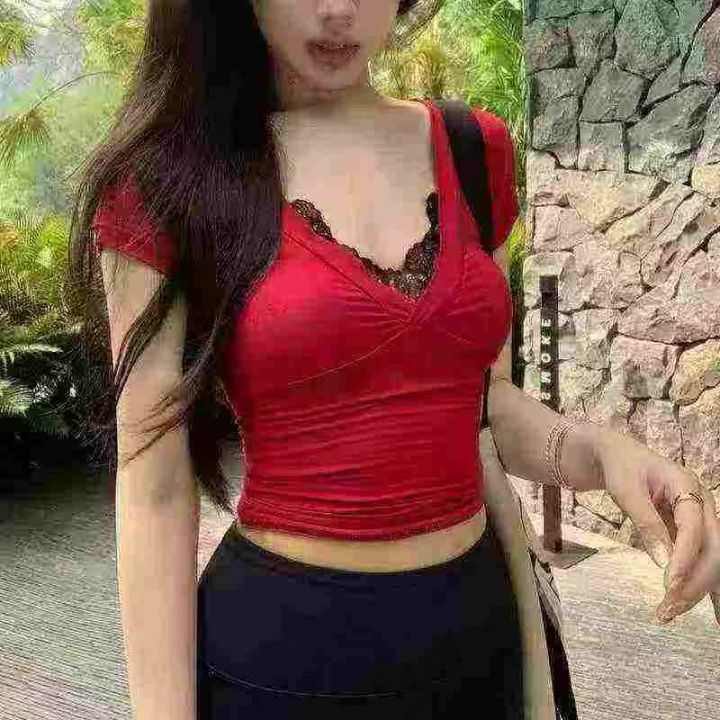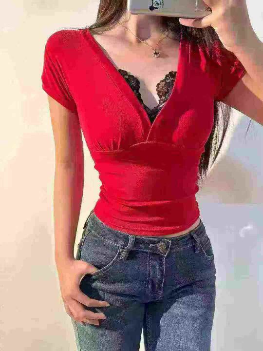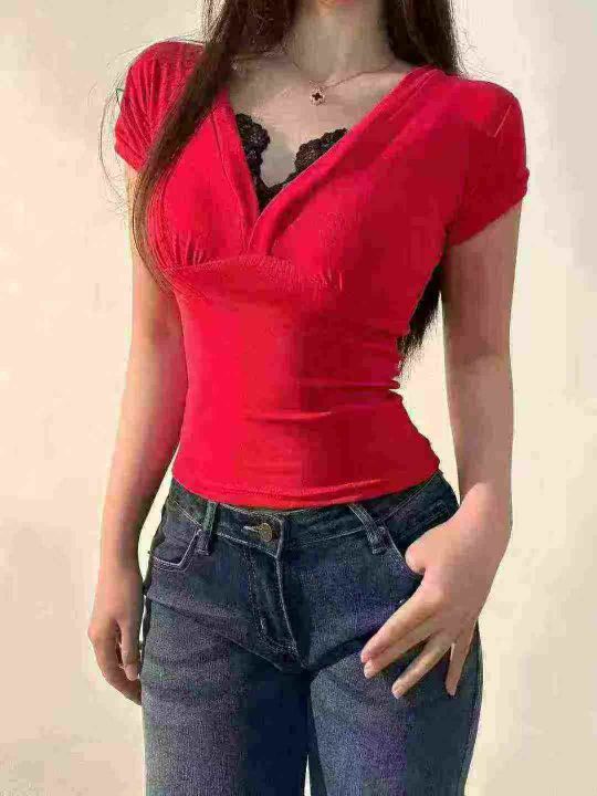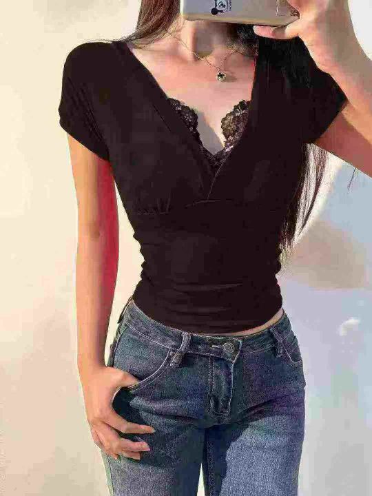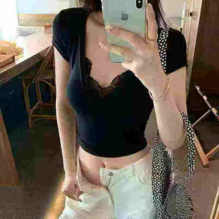 显瘦性感纯欲V领蕾丝短袖T恤女夏昆士兰平纹辣妹正肩上...