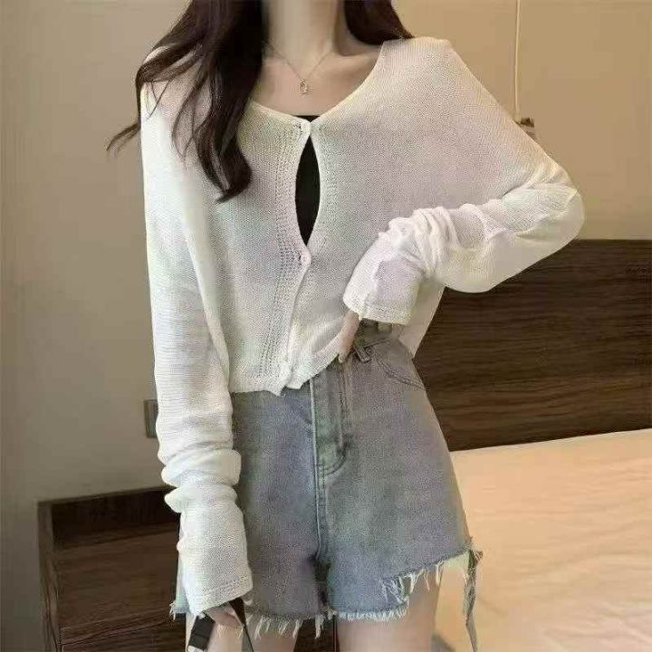 春夏新款冰丝韩系穿搭净版简约宽松薄款纯色针织长袖开...