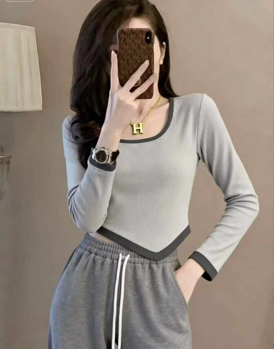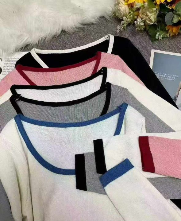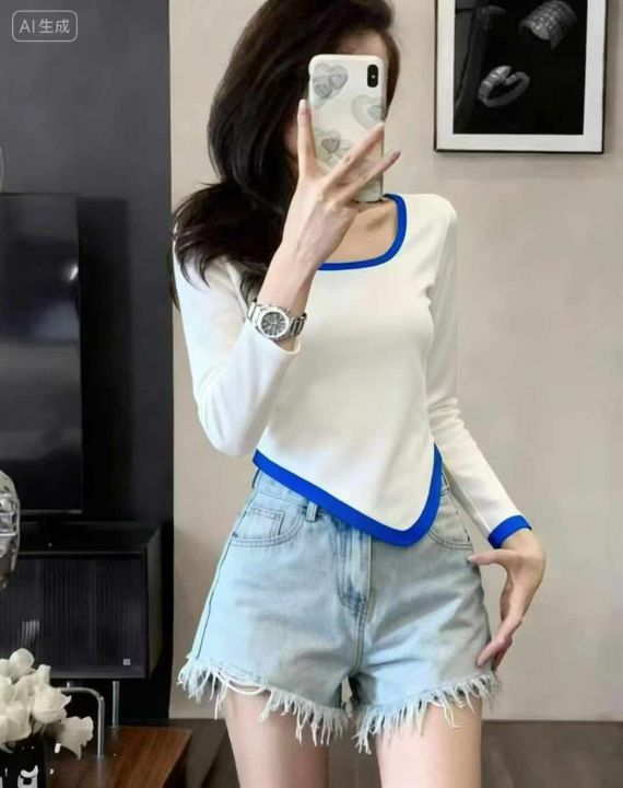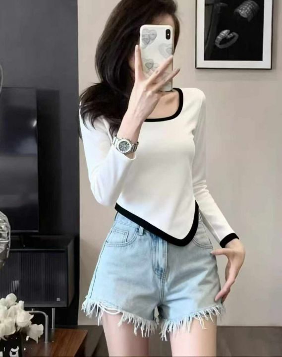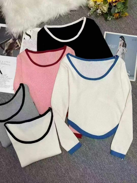 秋冬新款撞色高腰设计不规则纯欲风短款针织套头毛衣,...