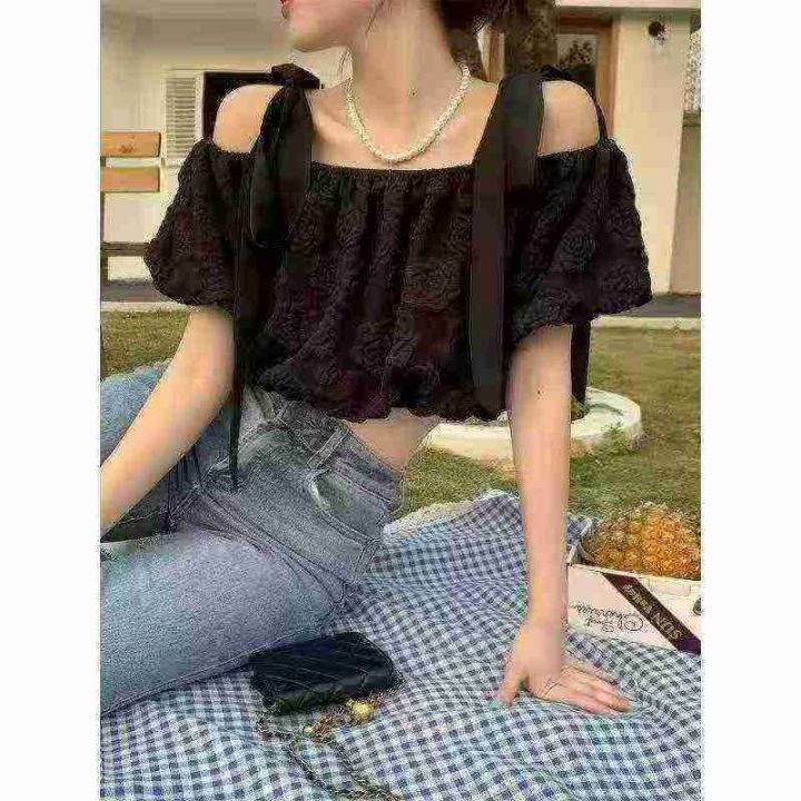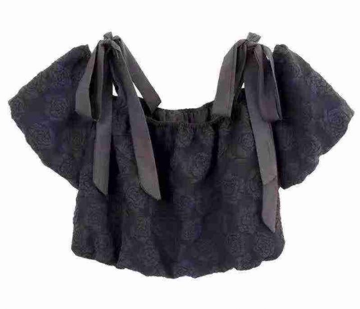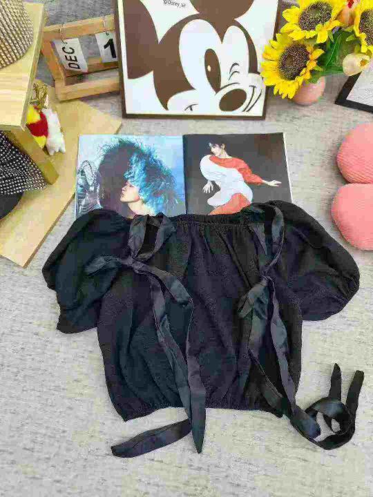 [發]70件左右,女装法式一字肩短袖甜美系带小个子短款泡泡袖上衣,独立包装 6.8清