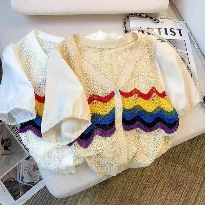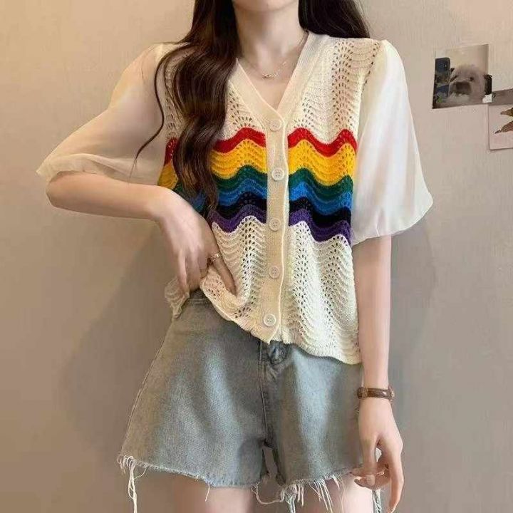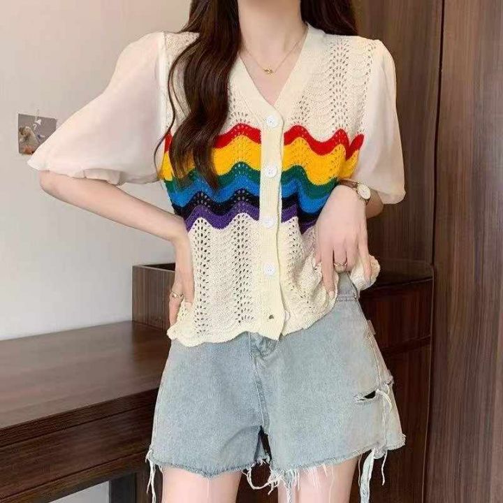 夏季新款条纹镂空冰丝雪纺拼接泡泡袖宽松针织毛衣开衫...