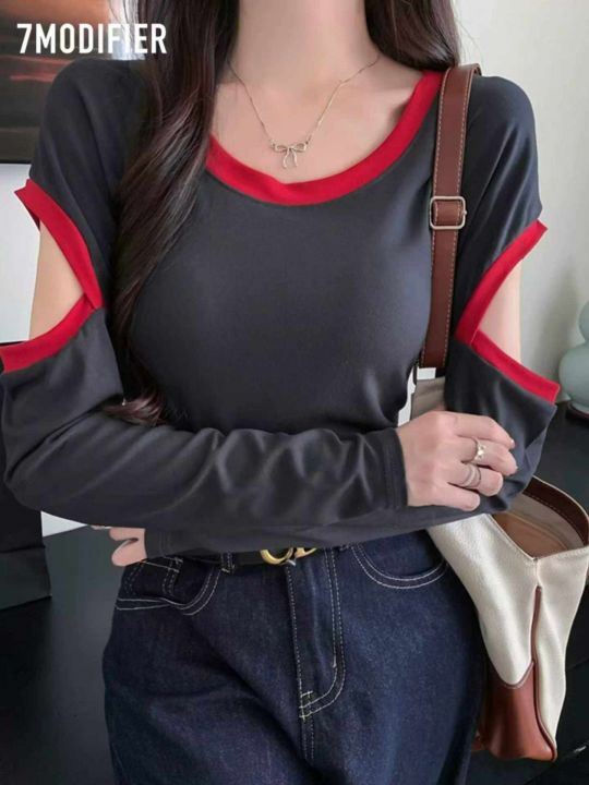 春秋网红新款撞色拼接漏肩韩系纯棉长袖T桖,独立包装...