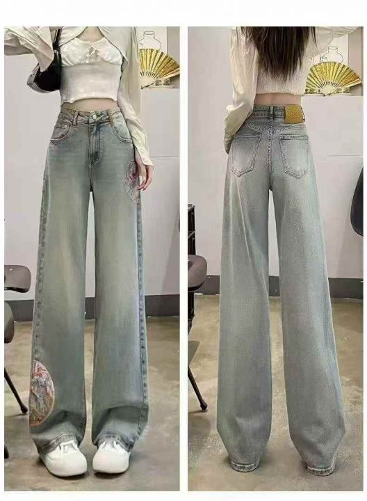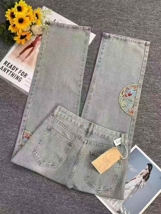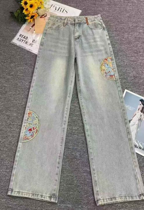 秋季新款洗水棉网红复古国风刺绣直筒阔腿牛仔长裤,独...
