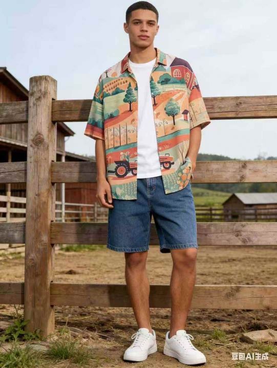 欧洲站夏季新款男士衬衫夏日风情时尚短袖免熨烫翻领衬...