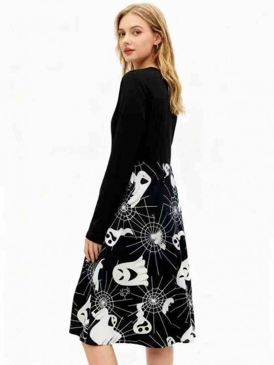 跨境电商赫本复古万圣节印花长袖大摆连衣裙送丝带,独...