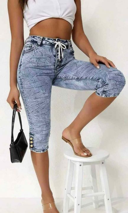 夏季复古蓝洗水棉外贸原单男女同款松紧腰牛仔中裤,独...