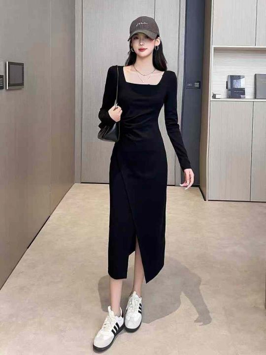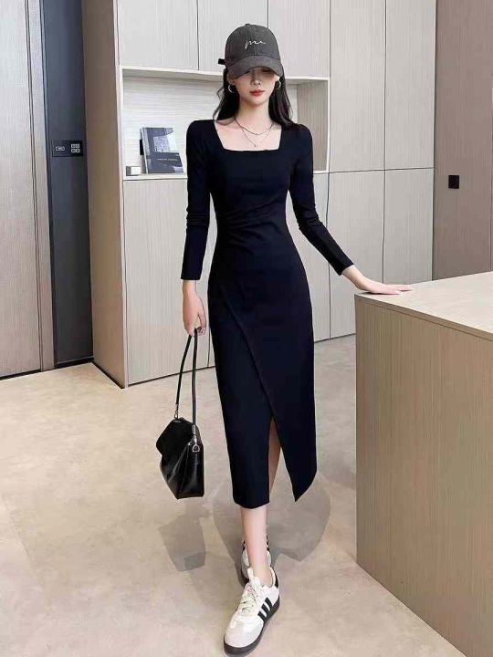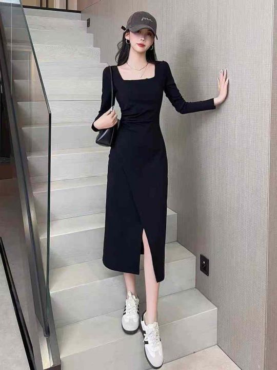☕️法式黑色方领开叉长袖连衣裙女秋季新款收腰显瘦长...