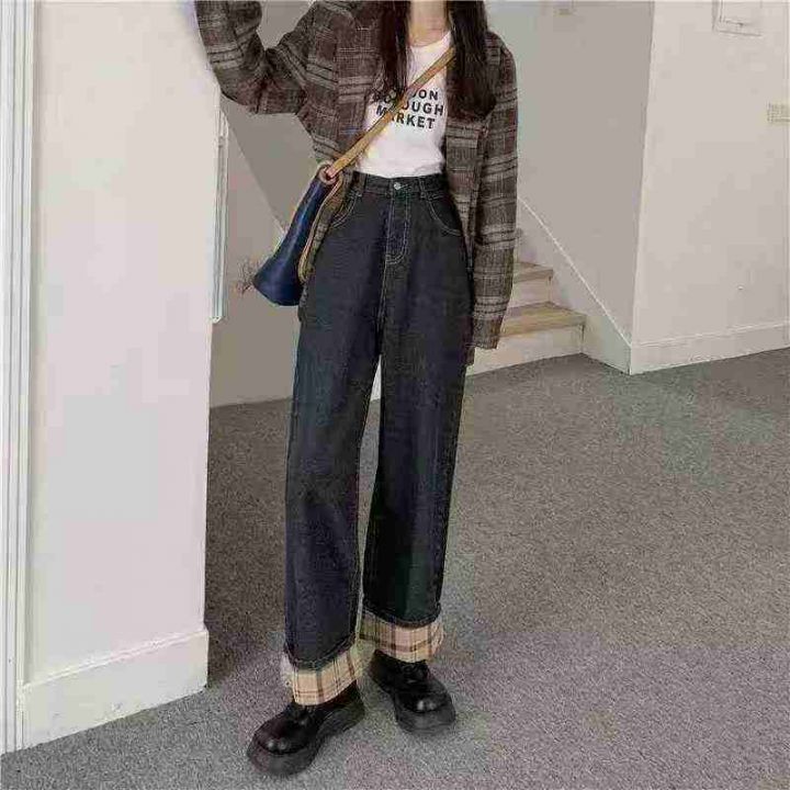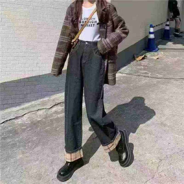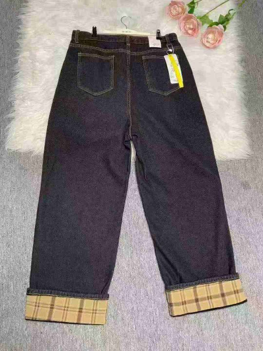 秋冬复古加绒加厚宽松显瘦牛仔裤女大码胖mm高腰直筒翻边阔腿长裤180件,独立包装带吊牌,尺码S~5XL全清福利价10.8元