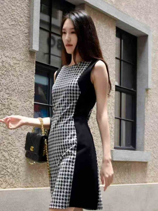 夏季新款立体剪裁拼接撞色带镶钻千鸟格修身圆领女士无袖背心连衣裙 独立包装带吊牌 数量850件 码数XL-3XL 全清5.5 分货加0.5