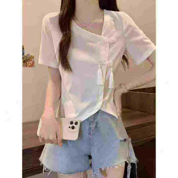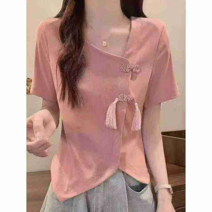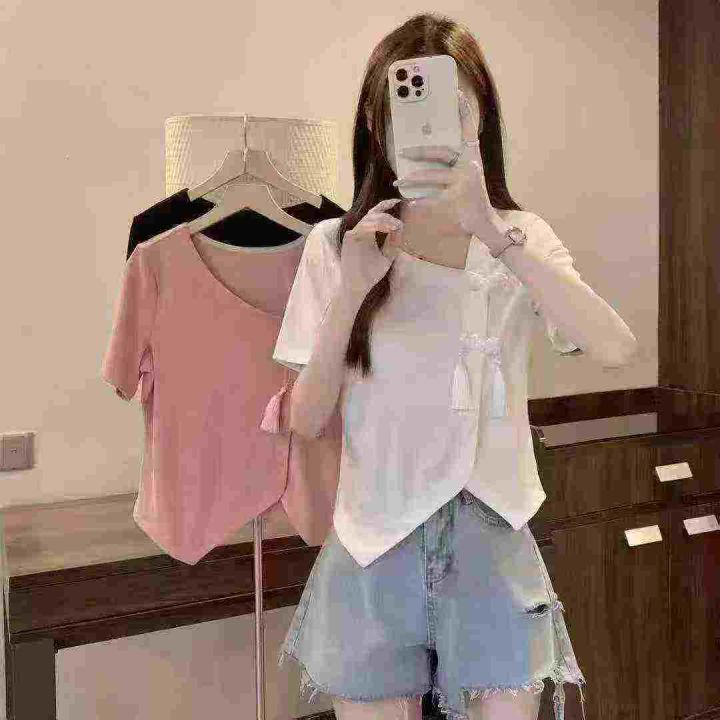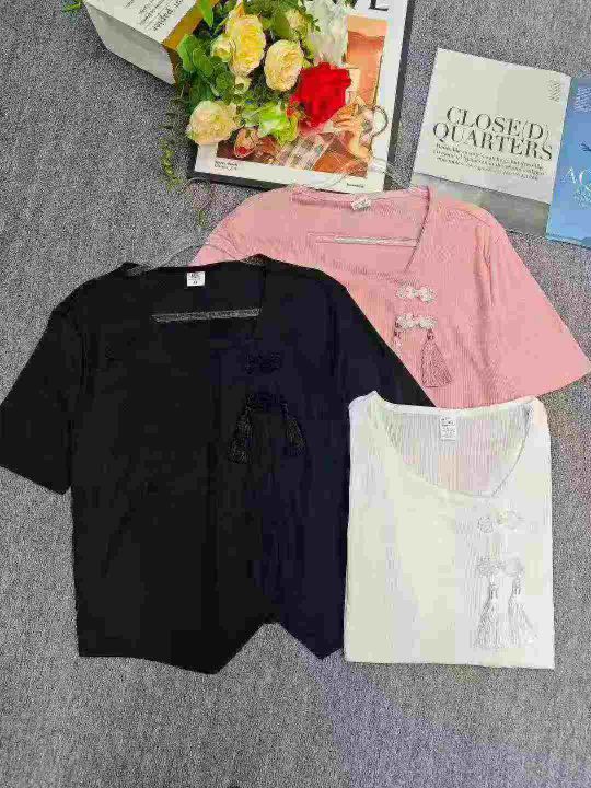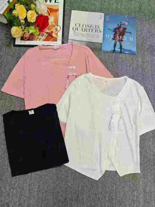 电商仓回收662件国风新中式精致盘扣不规则靓妹短袖T恤上衣,码数S-4XL。款式不错,面料柔软舒适有弹力,独立包装,分货➕0.5