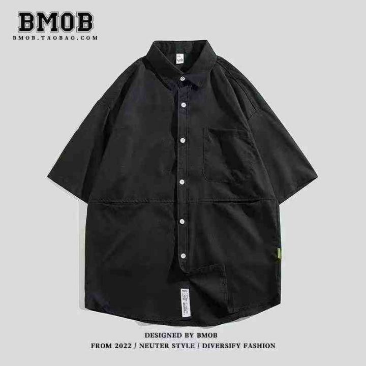 日系原创短袖工装衬衫男夏季纯色宽松大码多口袋衬衣,...