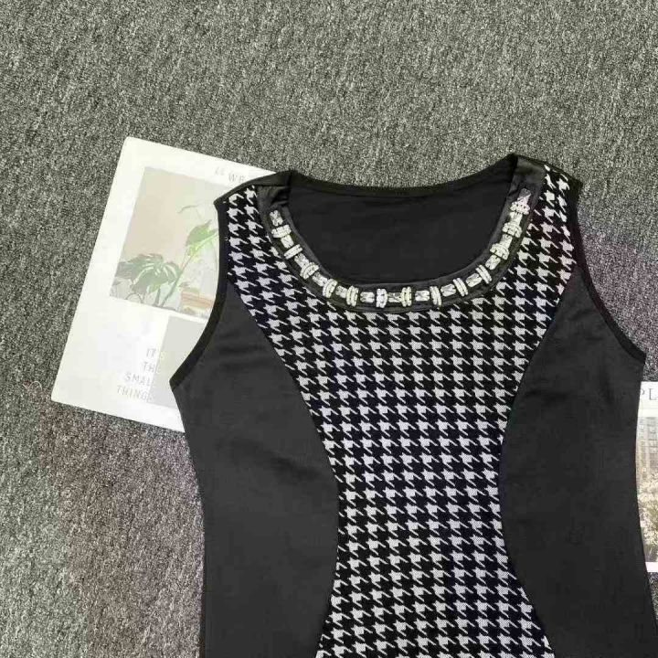 夏季新款立体剪裁拼接撞色带镶钻千鸟格修身圆领女士无...