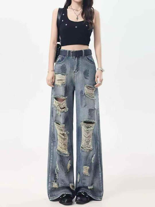 复古扎染废土风破洞女牛仔裤水洗垂感阔腿拖地裤,码数...