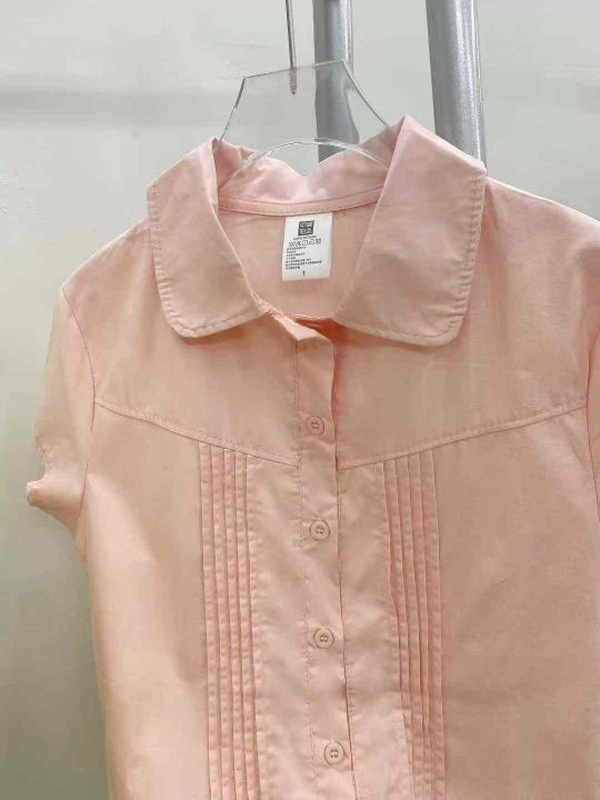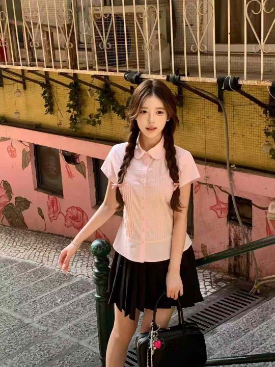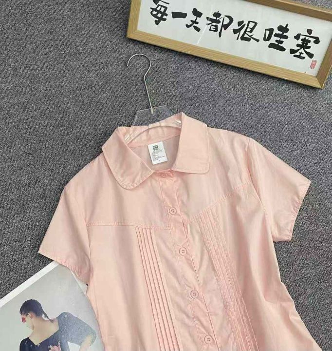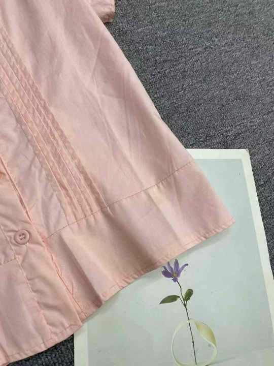 韩系甜美粉色短袖衬衫595件7.8,娃娃领,压褶设计,后...