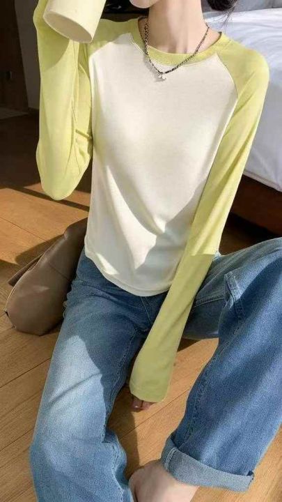 春季新款圆领撞色插肩韩版基础百搭显瘦长袖上衣,工厂...