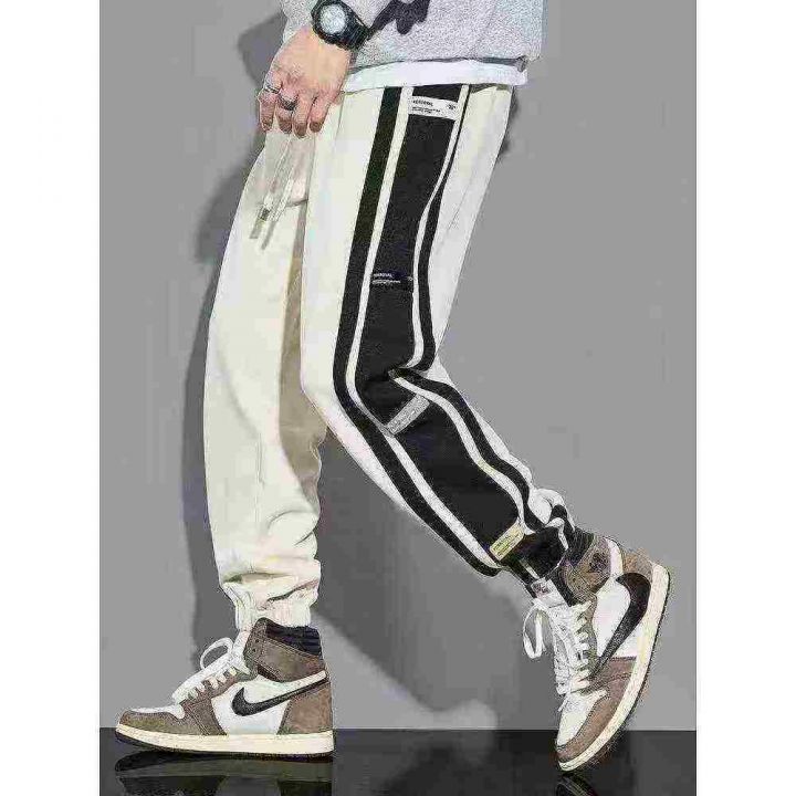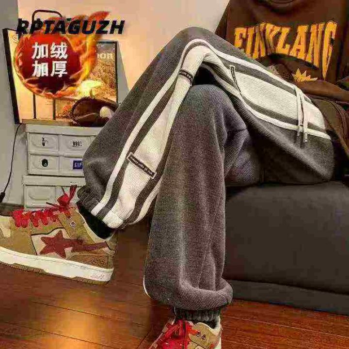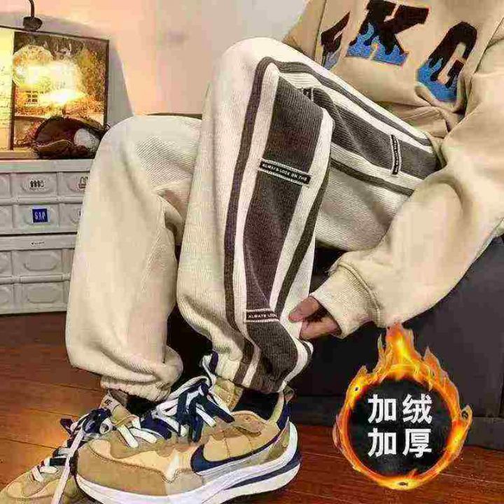 侧边条纹灯芯绒男冬季加绒加厚潮牌宽松束脚裤子,整款...