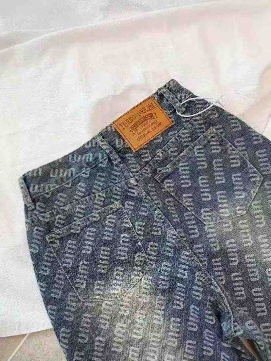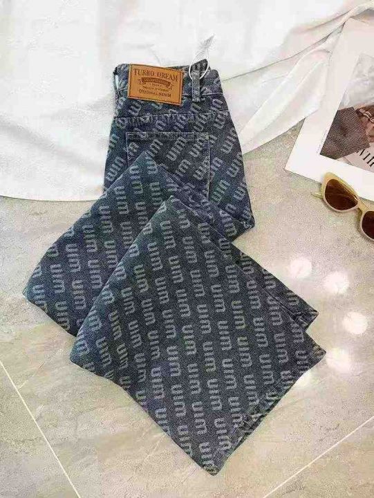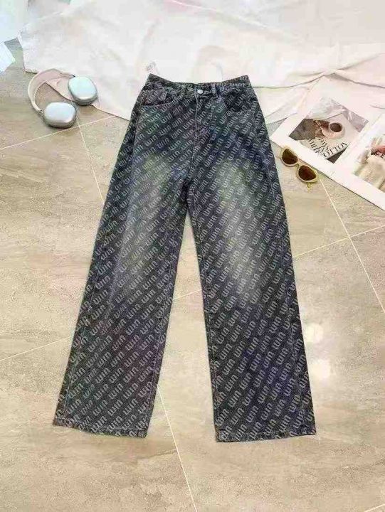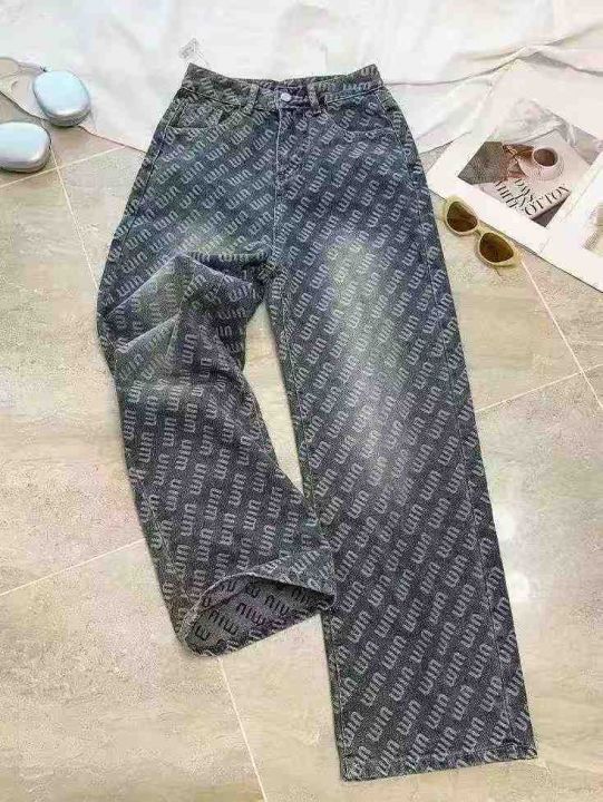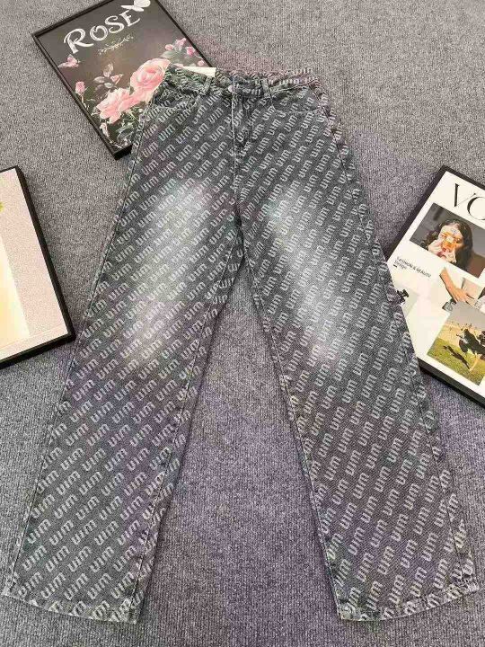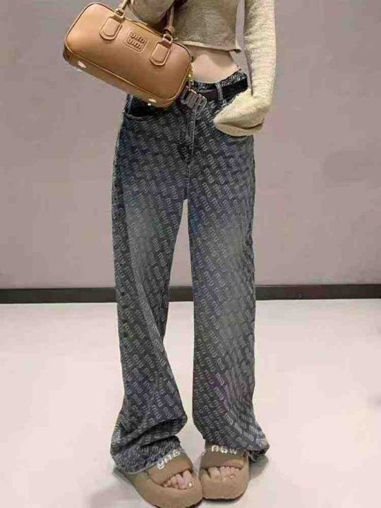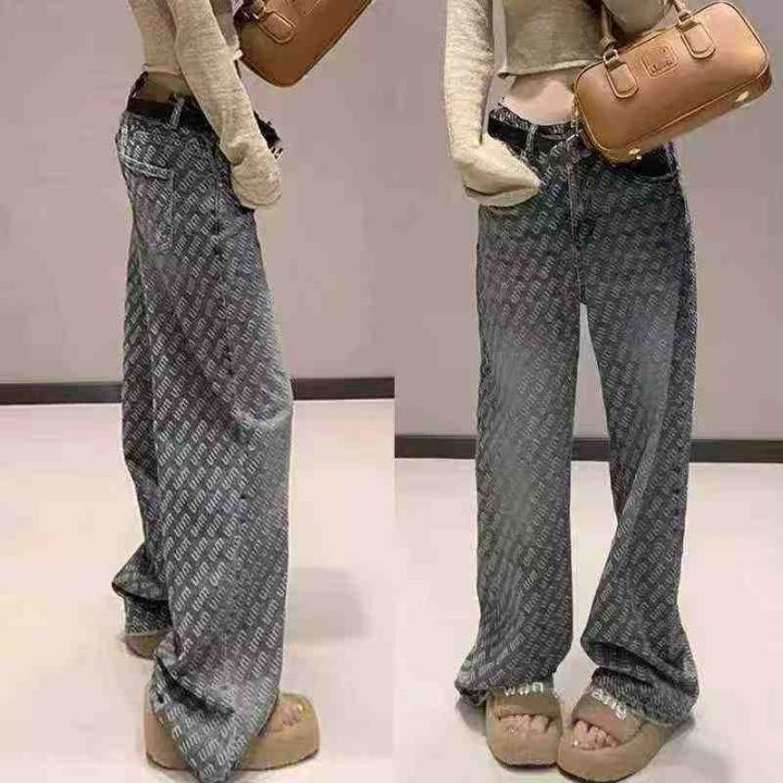 美式复古潮流满印字母直筒牛仔裤女新款高腰宽松阔腿裤...
