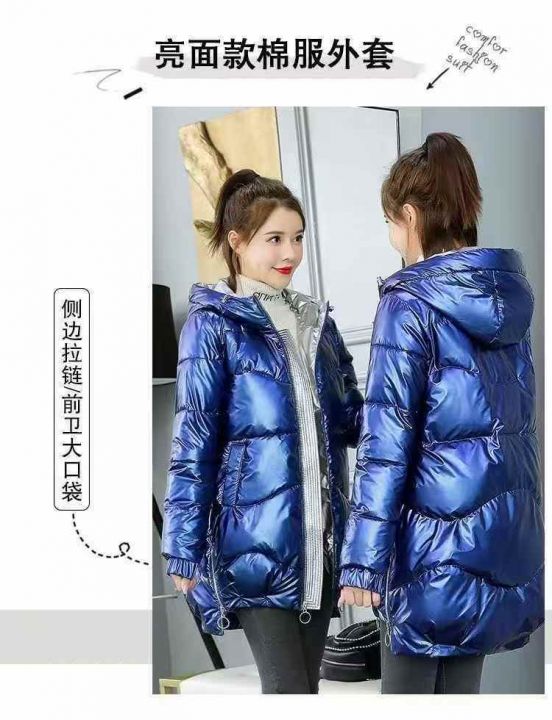 免洗棉服女亮面,韩版棉衣女中长款冬季宽松加厚连帽羽...