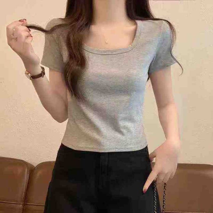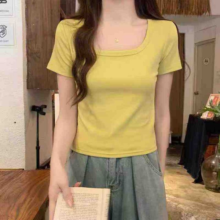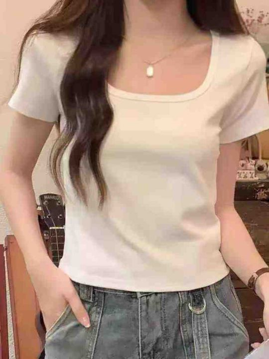 ☕️韩版正肩方领露锁骨短袖t恤女夏季修身显瘦u领短款...