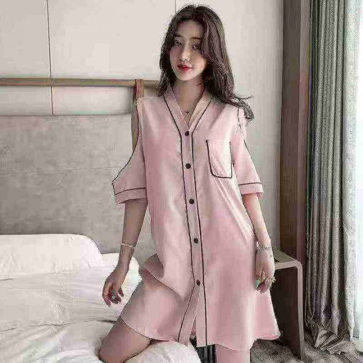① 网红冰丝性感露肩韩版宽松家居睡裙!独立包装,整款五色,有部分长袖款...