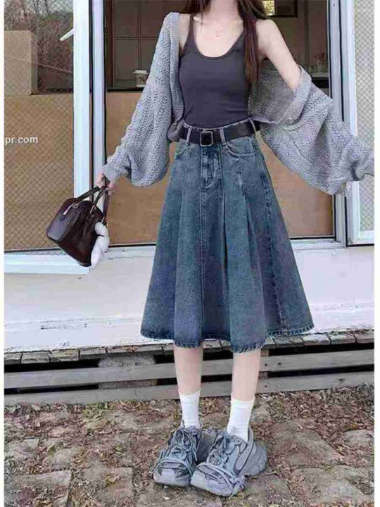 春夏新款复古牛仔半身裙女设计感高腰显瘦百褶a字中长...