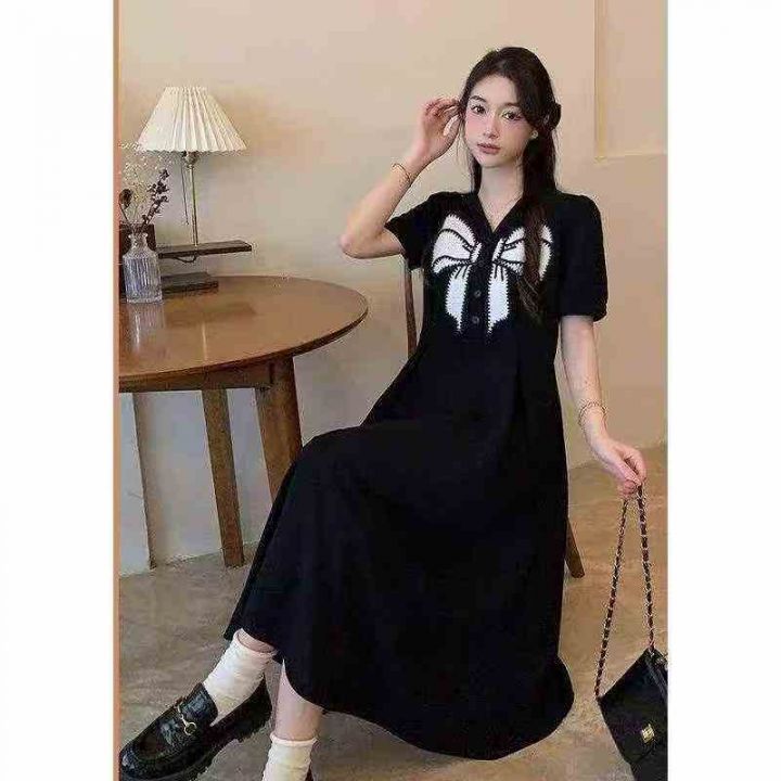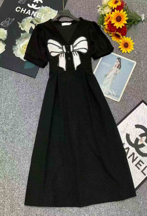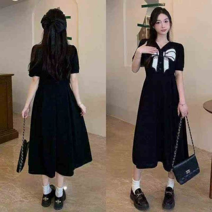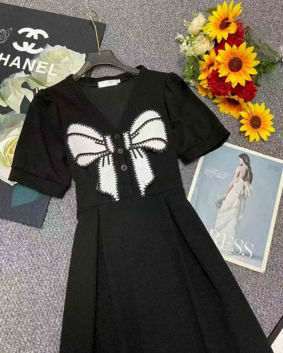 春季新款法式赫本风黑色蝴蝶结设计感小众气质收腰显瘦...