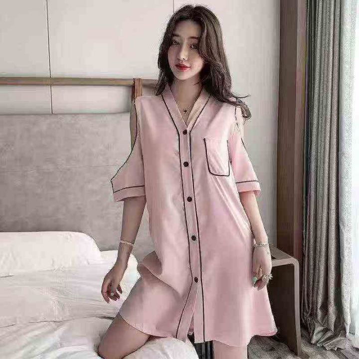 ① 网红冰丝性感露肩韩版宽松家居睡裙!独立包装,整...