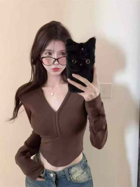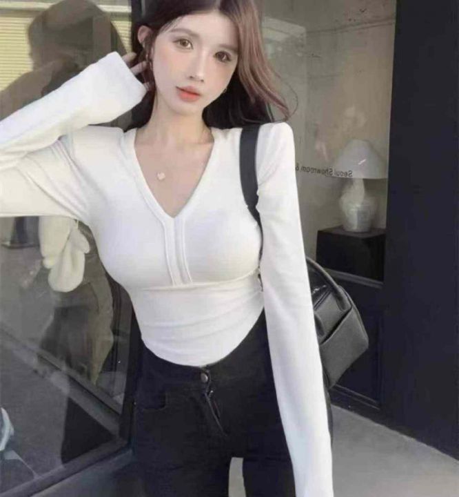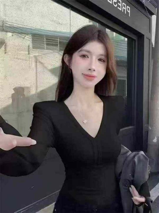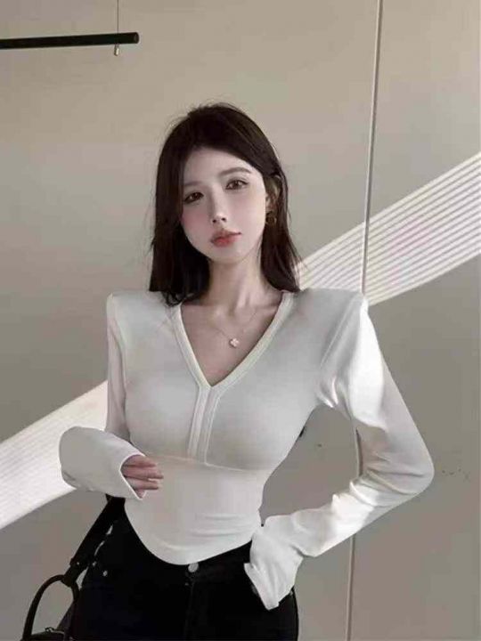 春季新款纯欲辣妹性感v领鱼骨垫肩长袖上衣,独立包装...