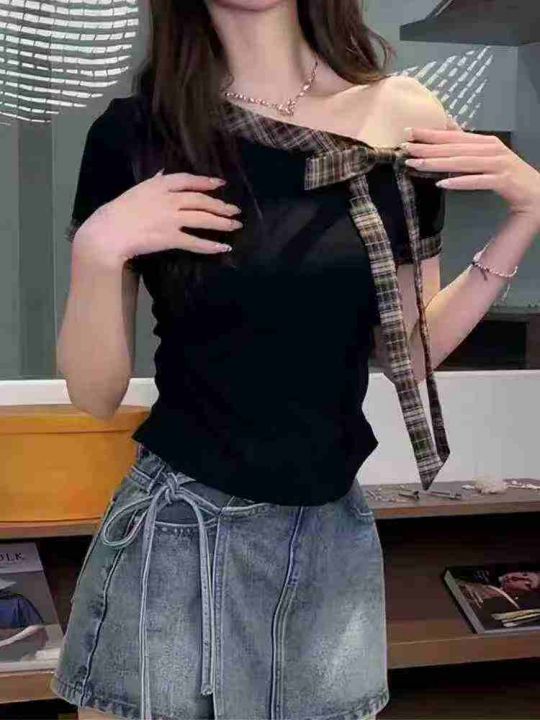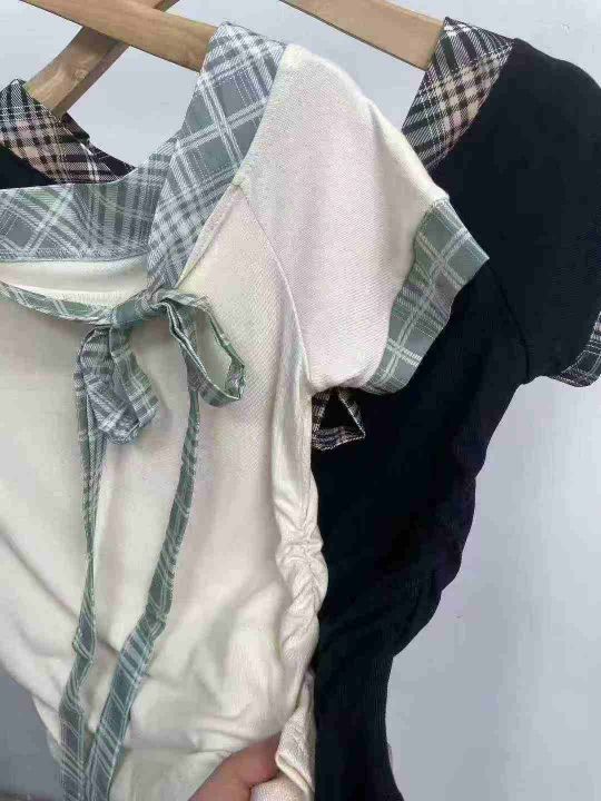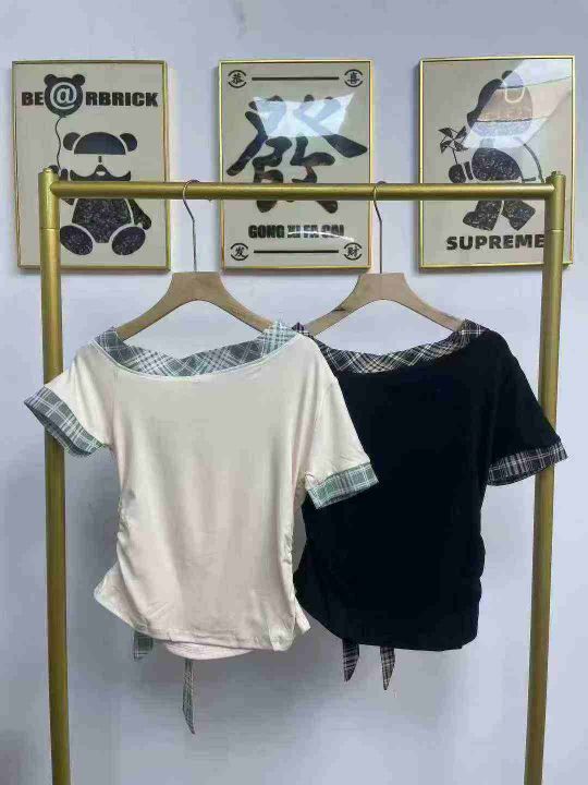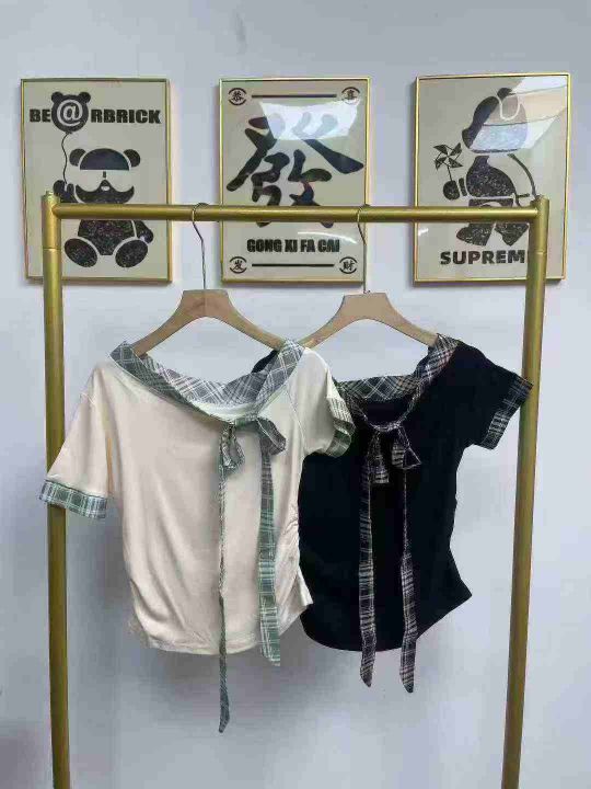 天猫在售款358件左右高品质夏季法系甜美风拼接条纹绑带蝴蝶结设计感漏肩上衣,码数M-L,单款两色,质量好,独立包装带吊牌