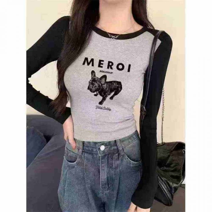 4.9清1230件夏季超好看辣妹撞色拼接字母长袖短袖t恤女春秋修身显瘦休闲百搭短款上衣!弹力