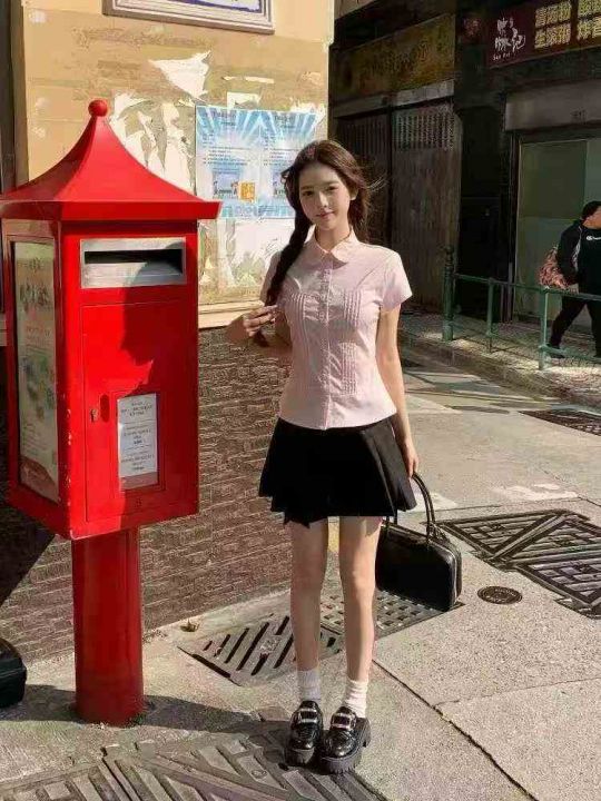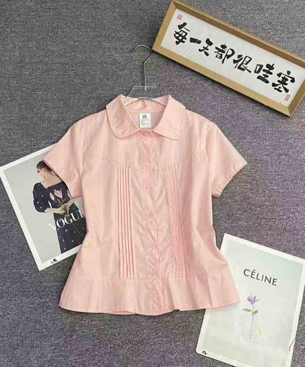 韩系甜美粉色短袖衬衫595件7.8,娃娃领,压褶设计,后...