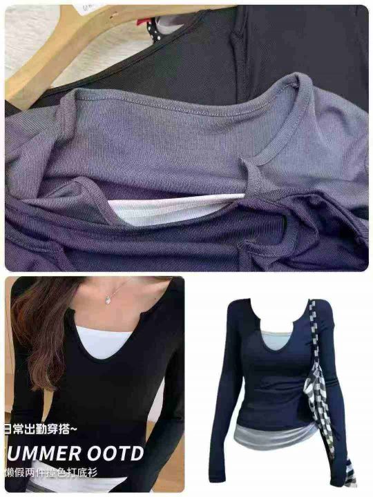 全清4.8元,6180件美式甜辣妹韩版假两件长袖t恤女春夏修身打底衫撞色纯欲显瘦上衣,独立包装,码数M-2XL,分货➕0.5