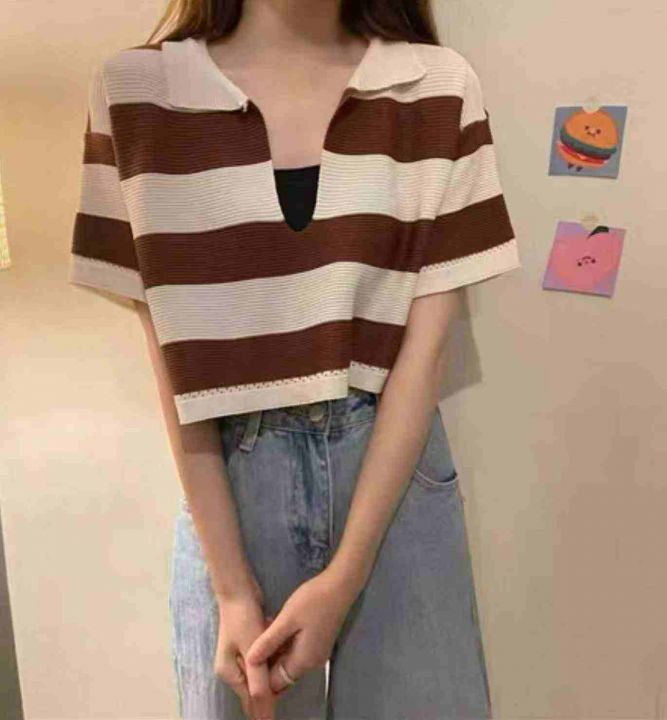 夏季新款撞色条纹宽松百搭Polo领针织短袖T+弹力修身显...
