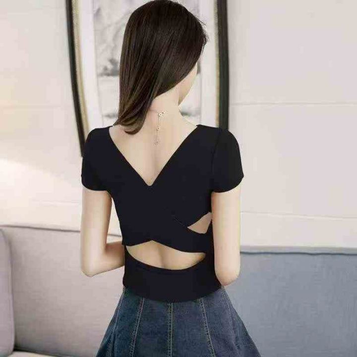 夏季新款韩版chic小心机露背弹力修身显瘦短袖针织小衫,独立包装,均码面料...