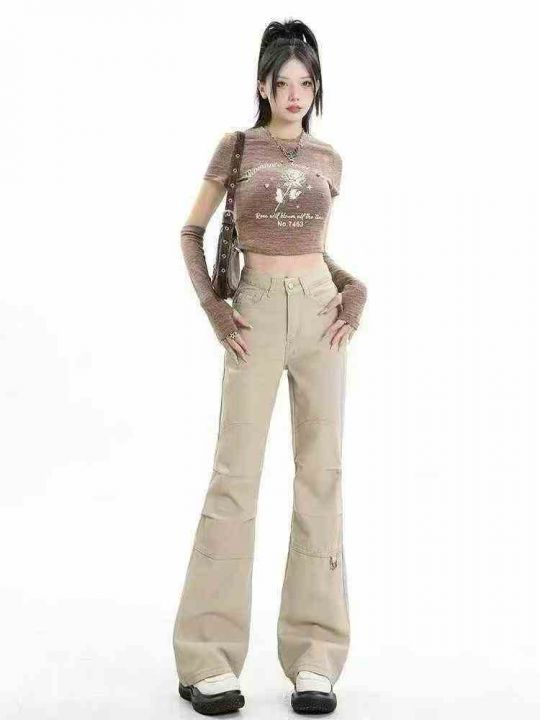卡其色喇叭裤工装裤高级感美式阔腿拖地微喇女牛仔裤,...