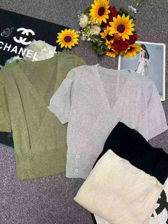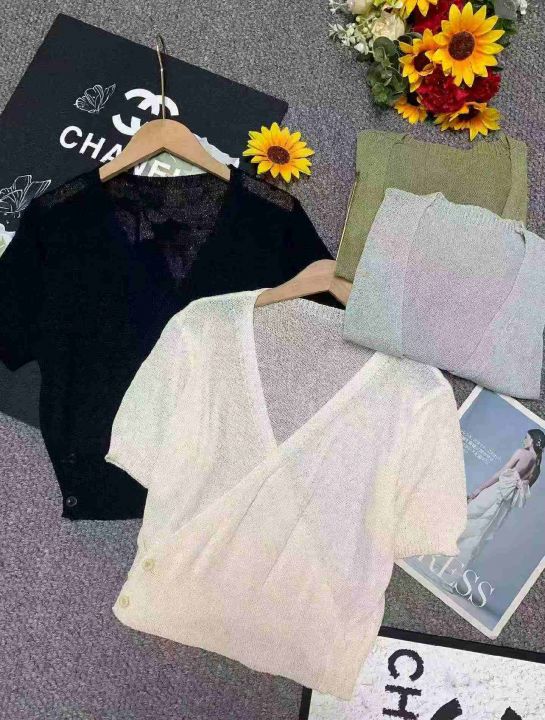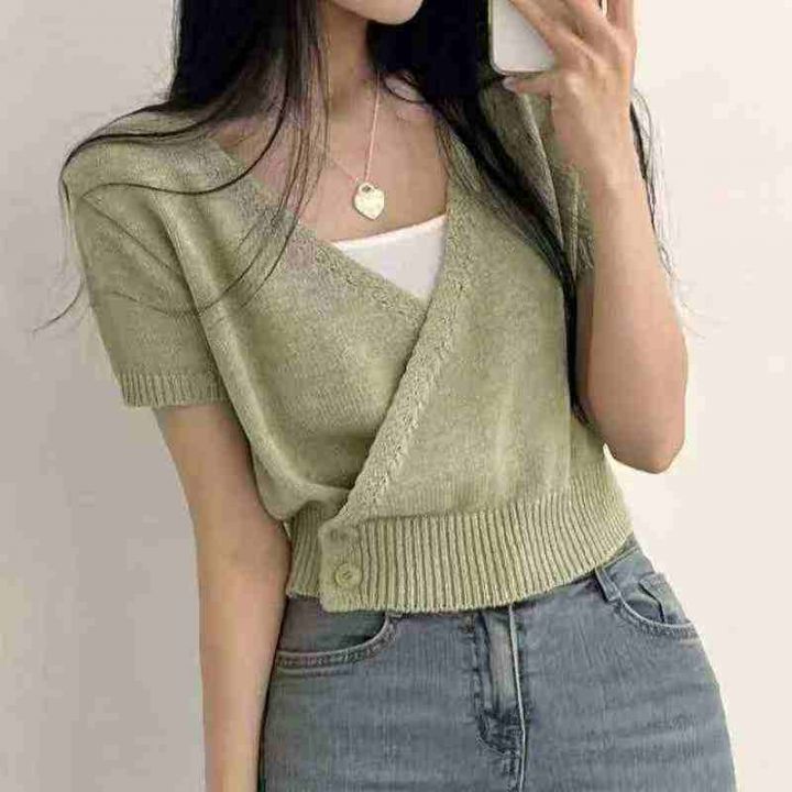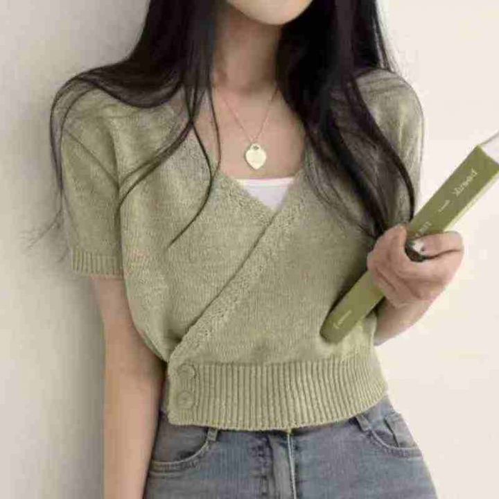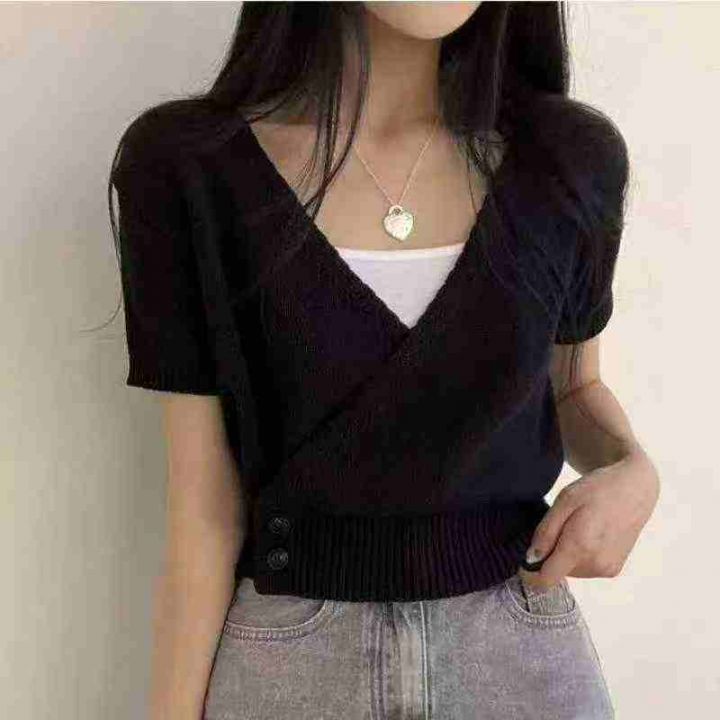 夏季新款法式小众设计感斜襟V领气质两粒扣收腰针织短袖T桖,独立包装,均码面料柔软舒适有弹力,538件,全清4.9元超低价秒杀!分货加一!