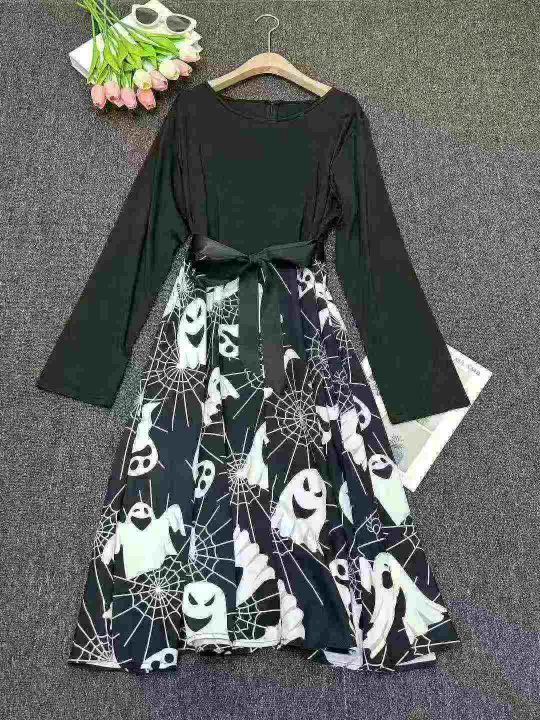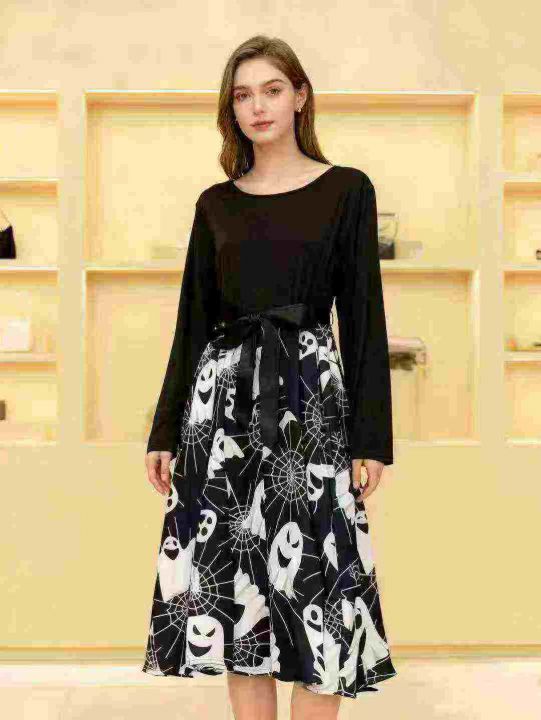 跨境电商赫本复古万圣节印花长袖大摆连衣裙送丝带,独...