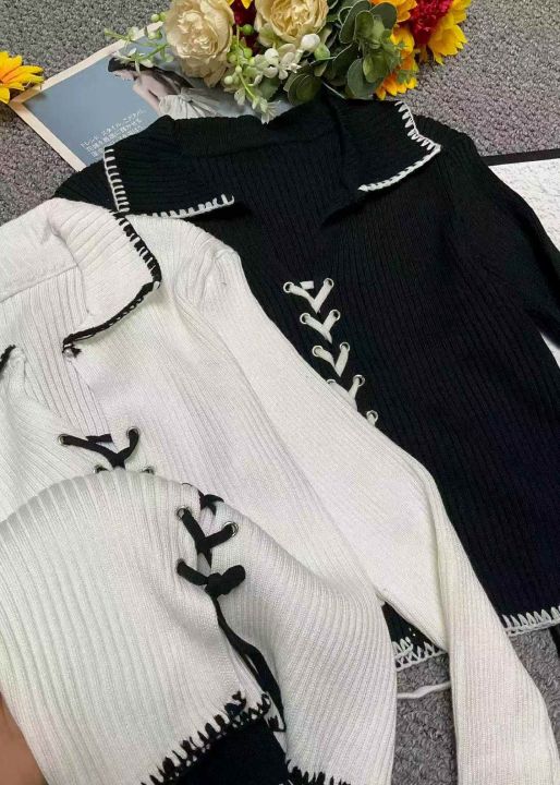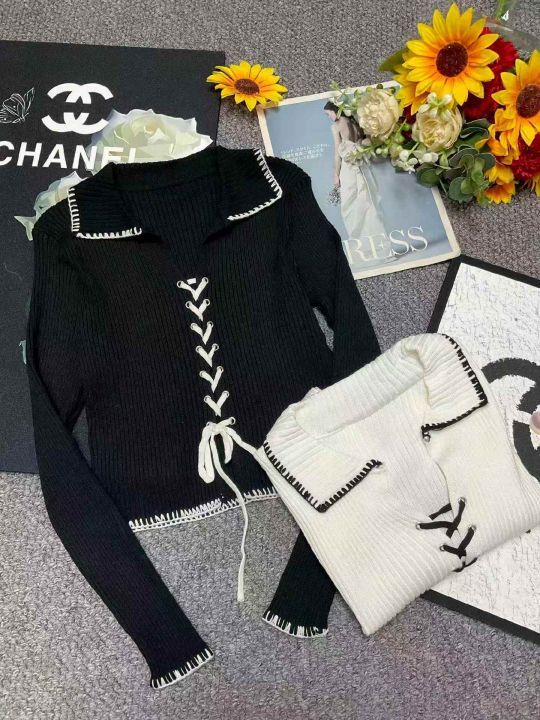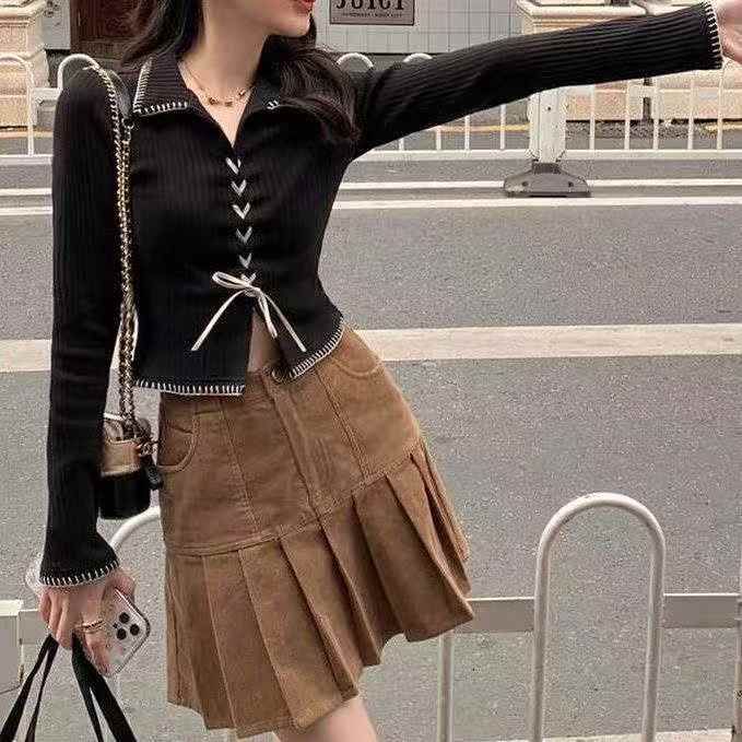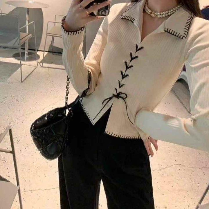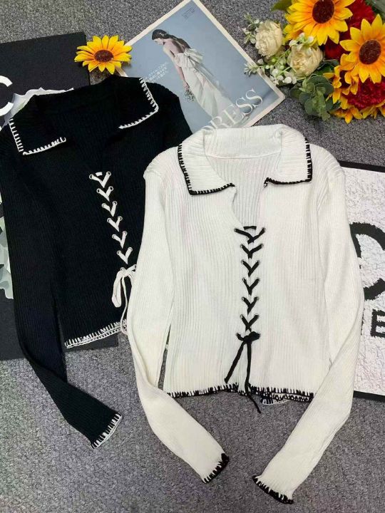 春季新款网红爆款韩系气质高级感甜辣风V领绑带针织开...