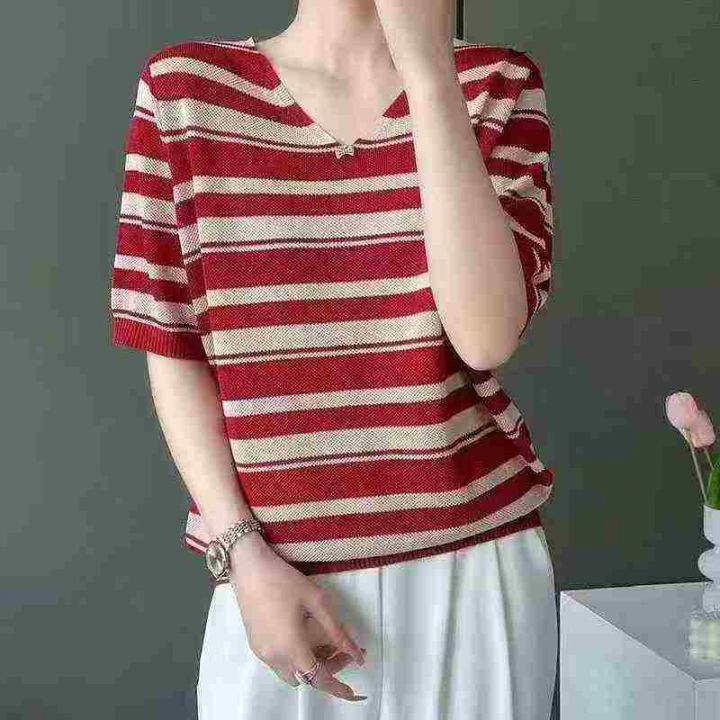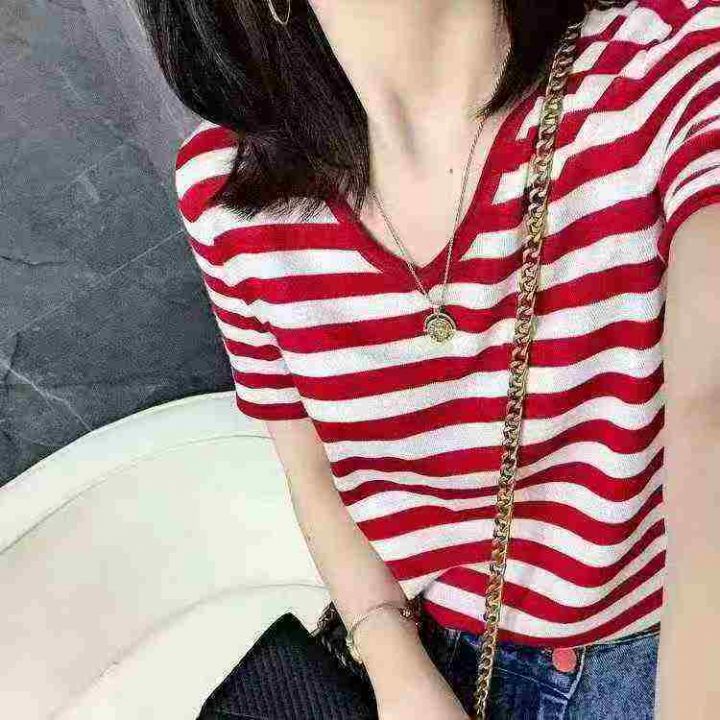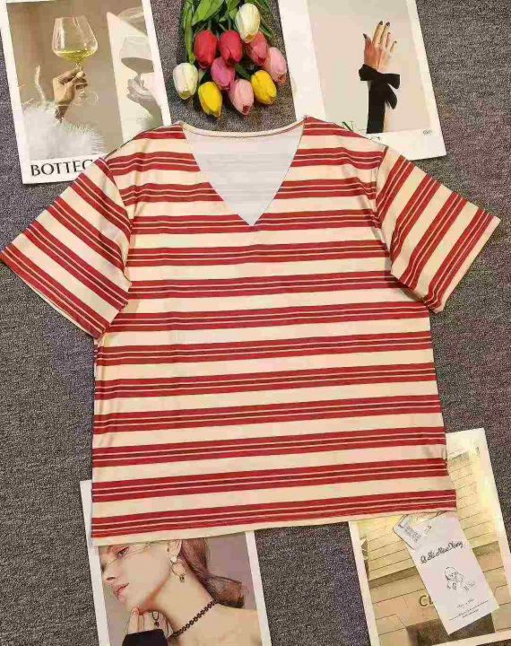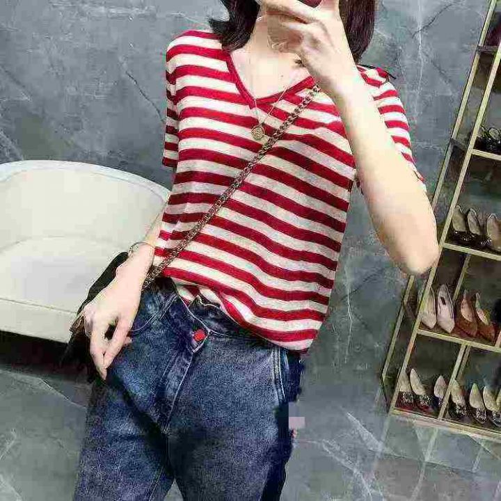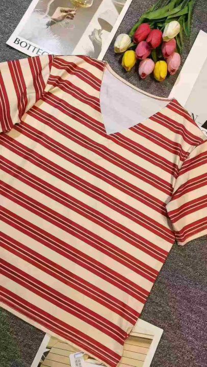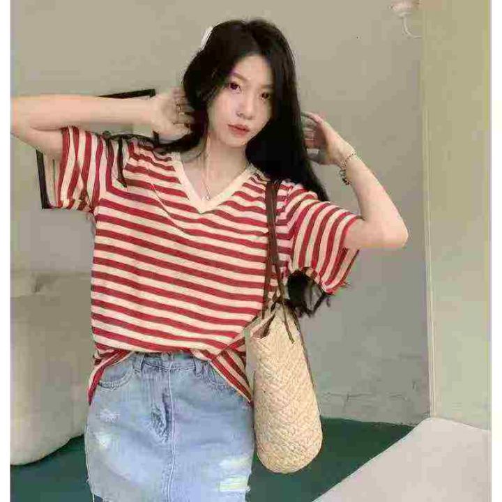 简约V领设计感红条纹宽松百搭T恤,[爱心]105件左右,款号#7017,码数S-2XL,穿80-140斤,[666]工厂原包装瑕疵,(模特图仅供参考)